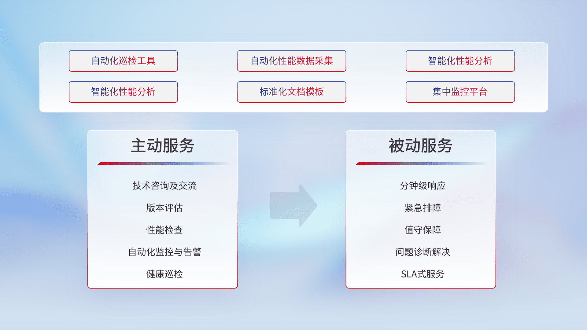 智能化工具和标准化文档,,,,保障服务质量,,提供主动服务(包含技术咨询、、、、版本评估、、、性能检查、、、自动化监控与告警、、健康巡检)和被动服务包含(分钟级响应、、、、紧急排障、、、、值守保障、、、问题诊断解决、、、SLA服务)。。。。