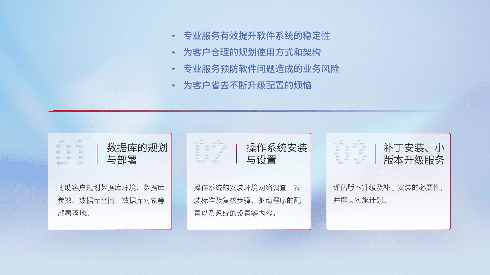 为客户提供软件规模升级、、、快速部署、、、按需配置的专业服务,,,,从数据库的规划与部署到操作系统的安装与设置,,,,再到补丁安装和小版本升级提供支持。。。
